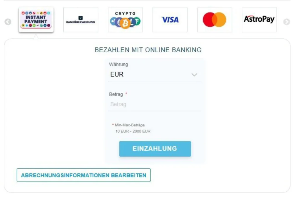 Einzahlungen erfolgen sofort und ohne Gebühren. Akzeptiert werden Visa, Mastercard, E-Wallets und klassische Überweisungen. Der Mindestbetrag liegt bei 20 €.